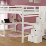 Give your child the perfect blend of style, safety, and function with the Velari Kids Full Loft Bed with Staircase. Crafted in a fresh white finish, this full-size loft bed features an integrated desk underneath and a sturdy staircase that doubles as storage drawers, keeping essentials within reach and the room clutter-free.
